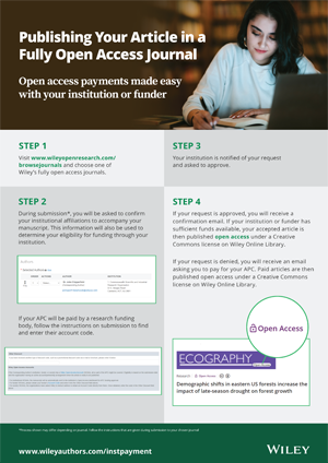 Your institution or funder may be able to help with open access Article Publication Charges (APCs) through a Wiley Open Access Account.